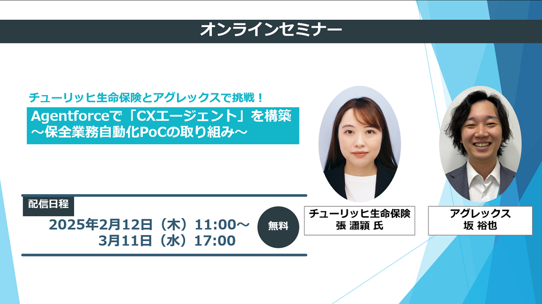 | 内容 | チューリッヒ生命保険株式会社と株式会社アグレックスが共同で、保全業務の完全自動化を目的としたAgentforce活用のPoCを実施。チューリッヒ生命保険のユーザー部門・システム部門とアグレックスが一丸となって業務整理とプロトタイプを作成し3ヶ月のアジャイル開発を行いました。そのPoCの結果と、導入に向けた課題や展望を業務効率化とCX向上の観点からお伝えします。 |